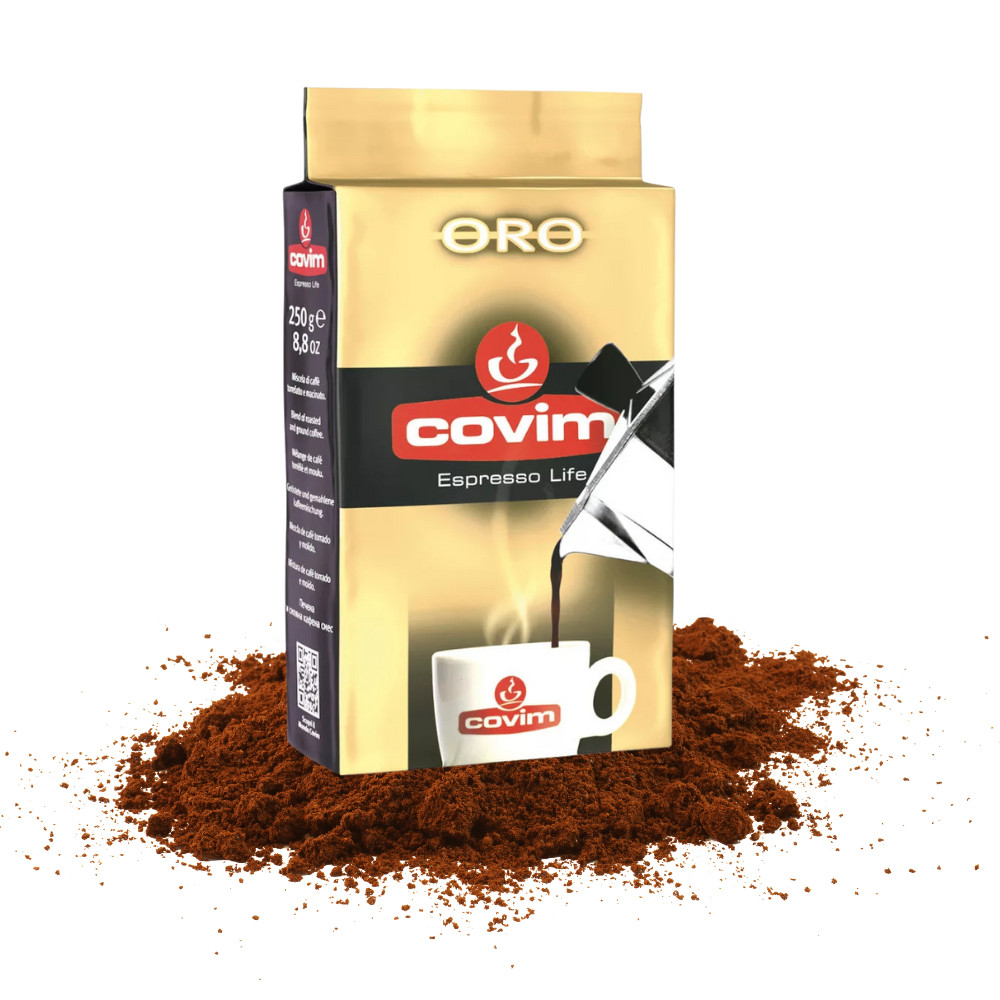 Covim Gold 250 g mleta kava – uravnotežena in prefinjena italijanska mešanica. Arabika in robusta poskrbita za gladek okus in bogato aromo. Idealna za espresso in moka aparat.