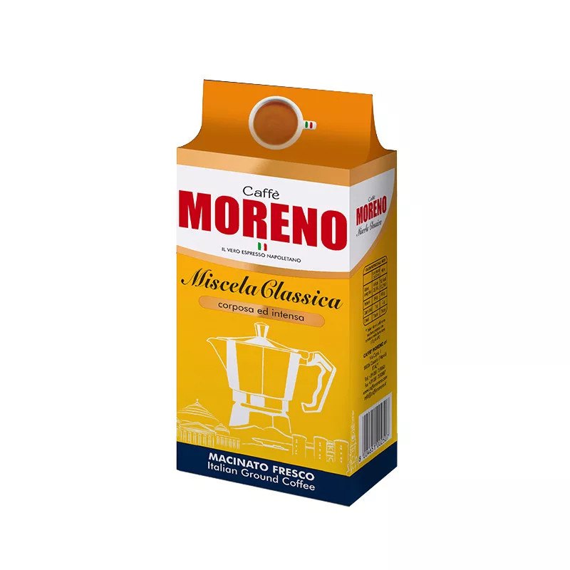 Moreno Classica 250 g mleta kava – klasična italijanska mešanica z izrazito aromo in uravnoteženim okusom. Skrbno izbrana zrna arabike in robuste ustvarjajo bogato, polno kavo z mehkim zaključkom. Idealna za espresso in moka aparat – popolna za vsak dan.